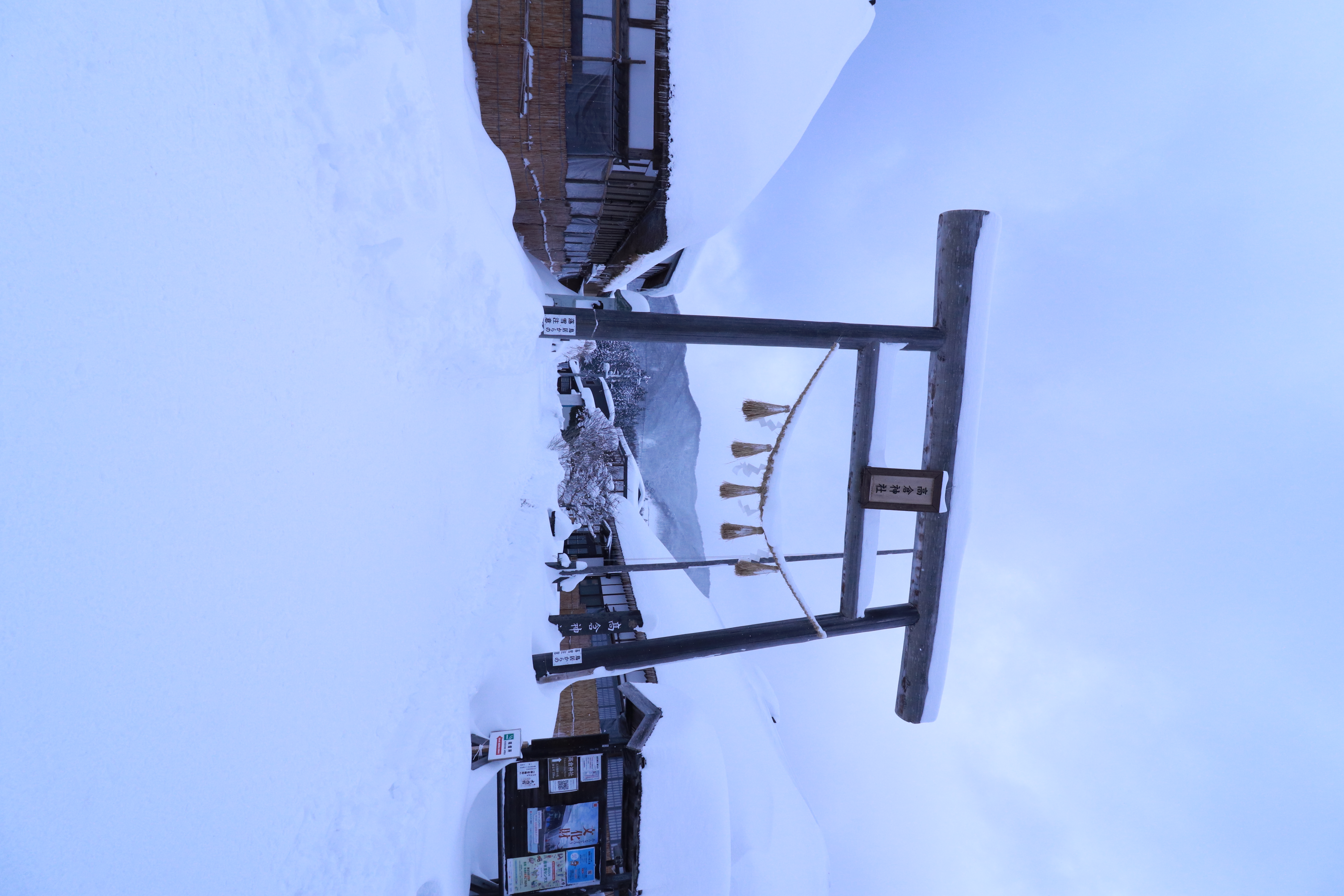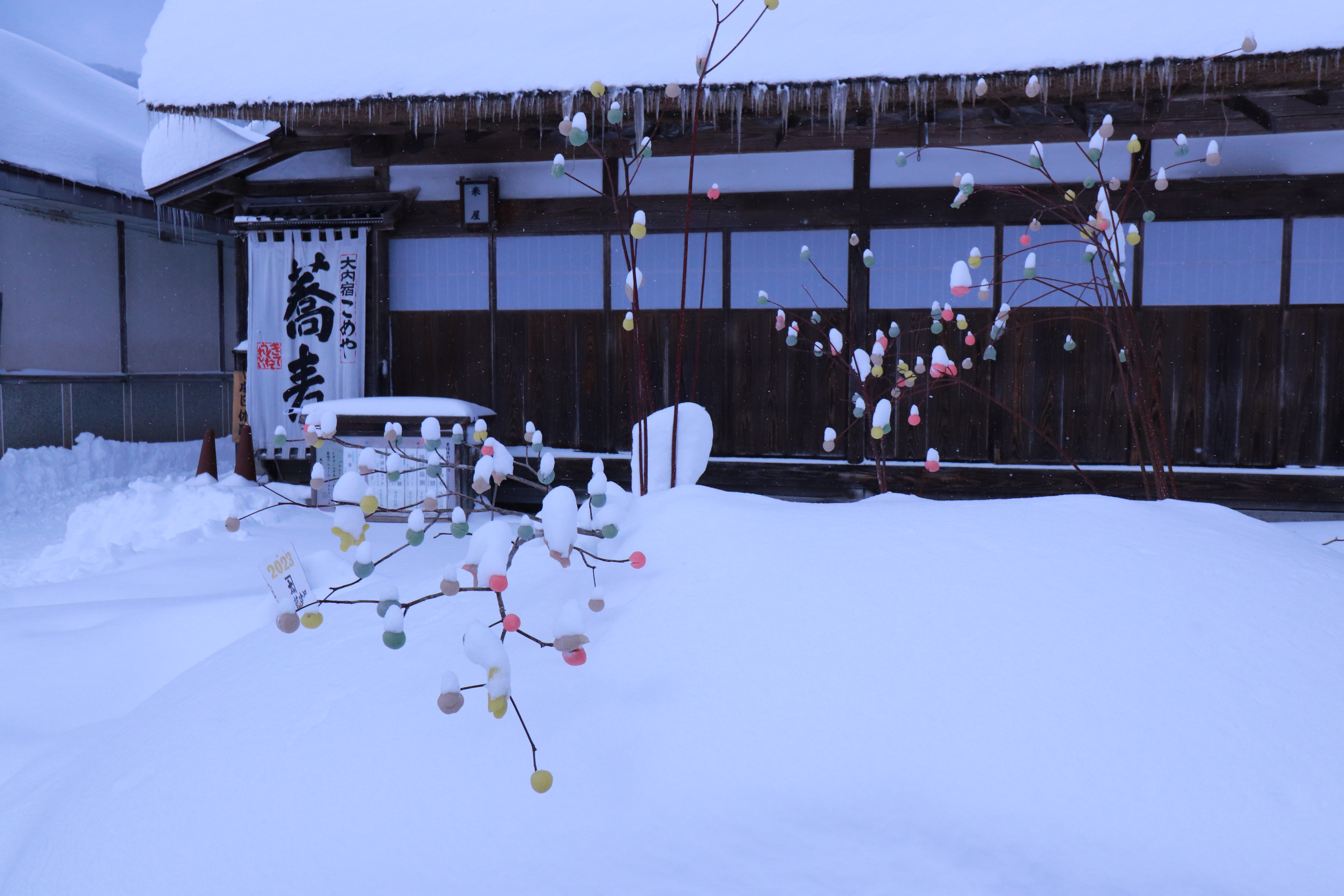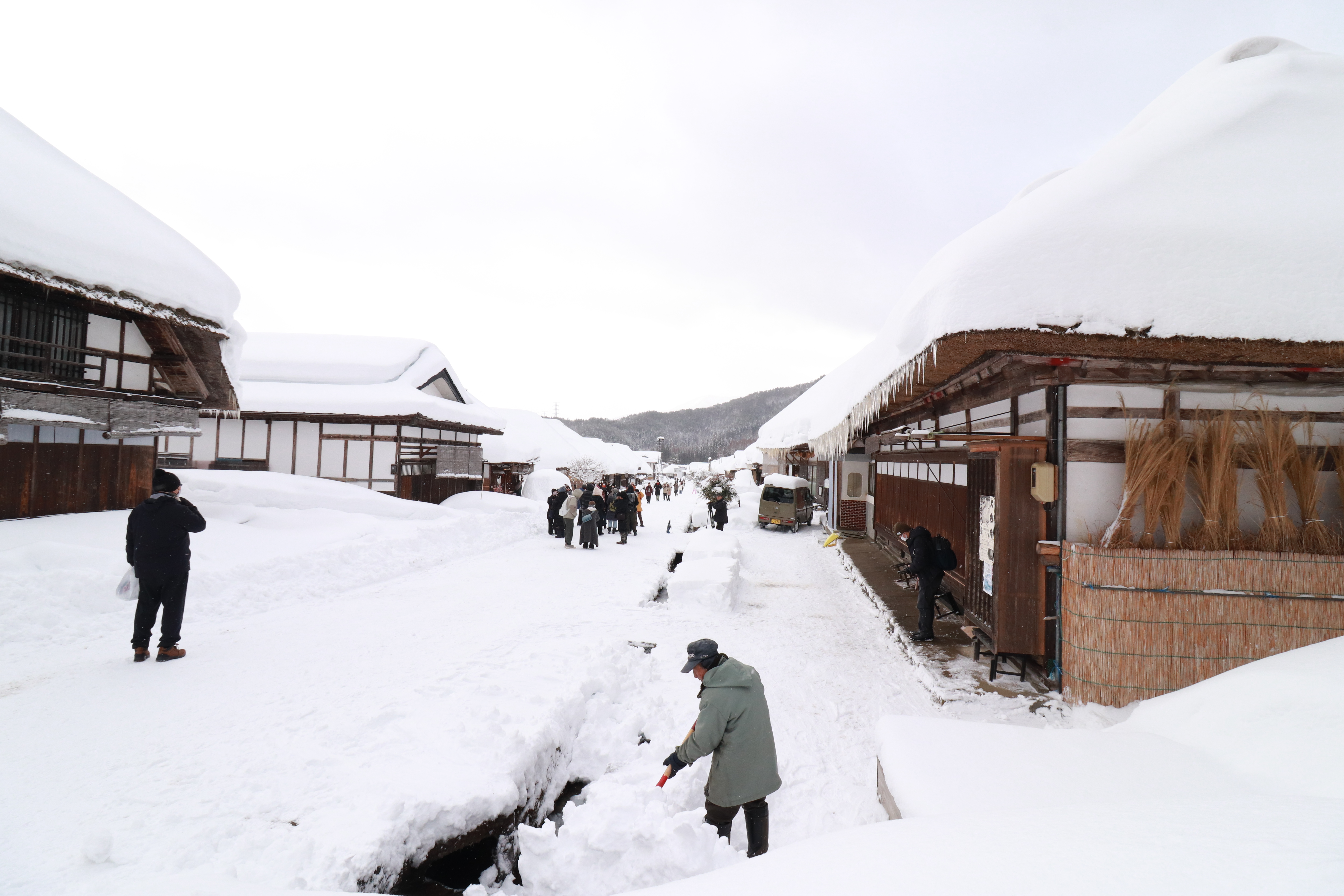 雪に埋もれた茅葺き屋根とろうそくの灯りが幻想的な「大内宿雪まつり」が開催され、夜の宿場が炎と雪に照らされます。